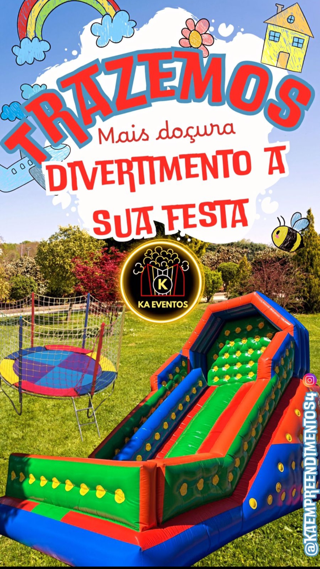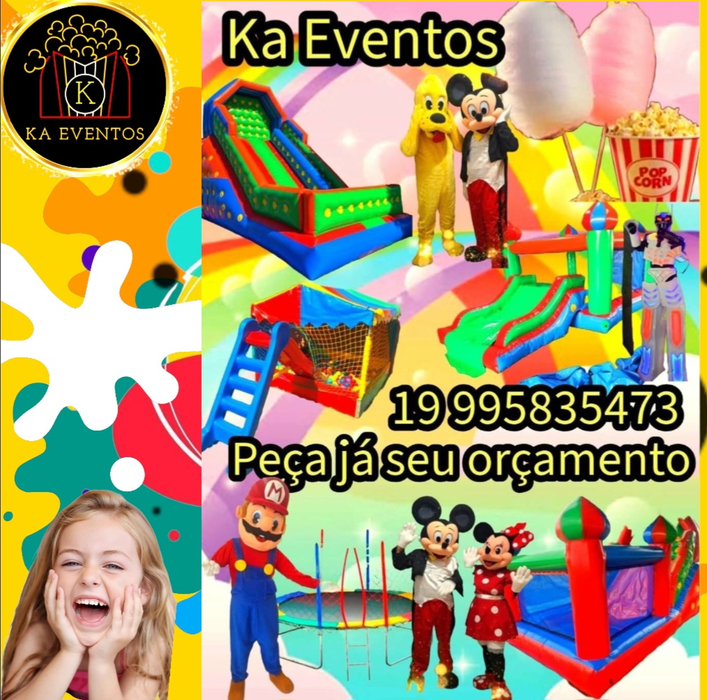 A Ka Eventos Produções é especializada em produzir eventos infantis e culturais, com uma grande variedade de Brinquedos Infláveis, Mascotes, Personagens Vivos, Pipoca, Algodão Doce, Raspadinha de Gelo, Crepes variados, para garantir a diversão das crianças. Nossa abordagem é focada em criar experiências únicas e inesquecíveis para os pequenos, sempre com muita alegria e segurança.